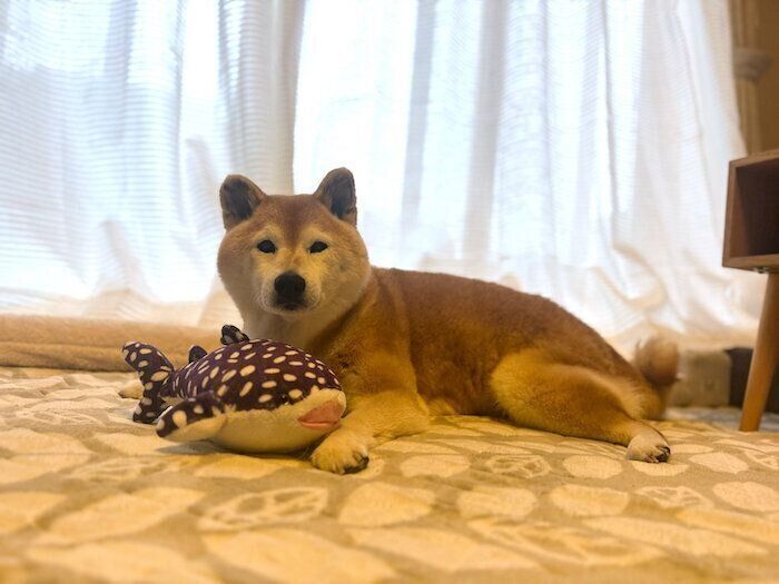 ジンベエザメさんは、マロたんが「うちの子」になったその日から、そばにいました。時には噛みつかれ、振り回され、穴が空いたり、放り投げられたり、よだれまみれになったり。タグは噛み切られ、何度も洗濯したので色褪せてしまいました。